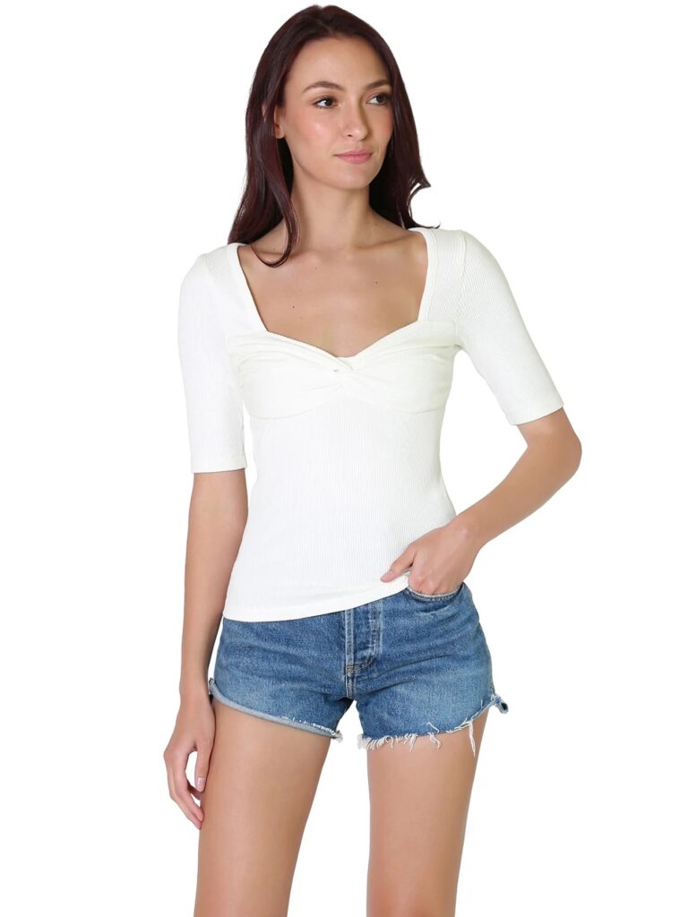 Made of lightweight ribbed fabric, this top flaunts a romantic twist at the bodice and a fitted silhouette that pairs well with high-rise jeans. Wear it on its own or layer it with a chic blazer. This piece will be a hero piece that will form the foundation for all your fall looks.