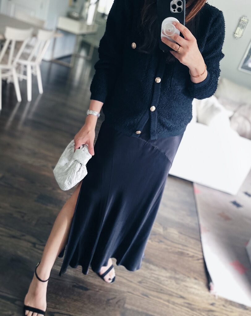 Here’s a little selfie of me rocking this piece! Styling a black satin maxi skirt and a black cozy cardigan for fall creates a chic and comfortable monochromatic look. The sleekness of the satin provides an elegant touch. Then choose a cozy cardigan-look for one in a chunky knit or a soft, warm fabric. The contrast in texture between the satin skirt and the cardigan adds depth to your outfit. Keep the footwear delicate and simple with a sandal or heeled mule and add a pop of contrast by accessorizing with a white handbag.