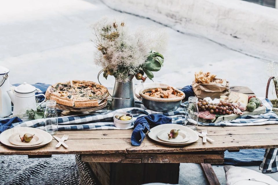 To minimize cleanup, opt for cool disposables and wood cutlery (it can be easily customized for place cards as well, with some snazzy Sharpie calligraphy). Mix and match glassware for a more casual vibe. Mason jars and old milk bottles are durable, cost-effective glassware for the outdoors and perfect for drinks both hot and cold. Whatever you do, don’t skip the flowers just because you’re picnicking! A centerpiece made with dried grasses, florals, and greens adds a rustic feel and natural beauty to your tablescape—and will last all season.