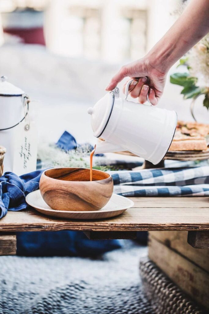 Market baskets are useful to carry items from the kitchen to the backyard and can double as decor. For the tabletop, opt for things that are more durable. Vintage enamelware, metal bowls, and wood items are a must. A few large trays for carrying food and beverages are helpful, and I use enamel or insulated pitchers for hot drinks and soups. Small baskets can double as serving bowls, and classic paper bags can quickly be rolled down and turned into great disposable bread baskets.