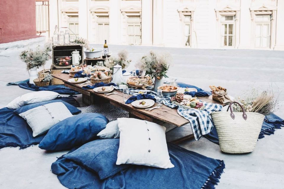 For a quick DIY table, I use wood crates and pallets as eating surfaces (test for splinters first!). Old doors or sheets of plywood also work. And forget chairs, there’s something much more intimate and cozy about sitting on the ground, so I bring various textiles and seating options outside. First, I put down old towels and sheets, then I arrange throws, rugs, and bed and couch cushions of various sizes. You can layer them together for extra comfort. Ottomans, bean bag chairs, or other low seats add a rich textural element, and comfortable cushions encourage guests to linger at the table. I also fill a basket with extra throws and blankets, as fall afternoons can turn a little chilly.