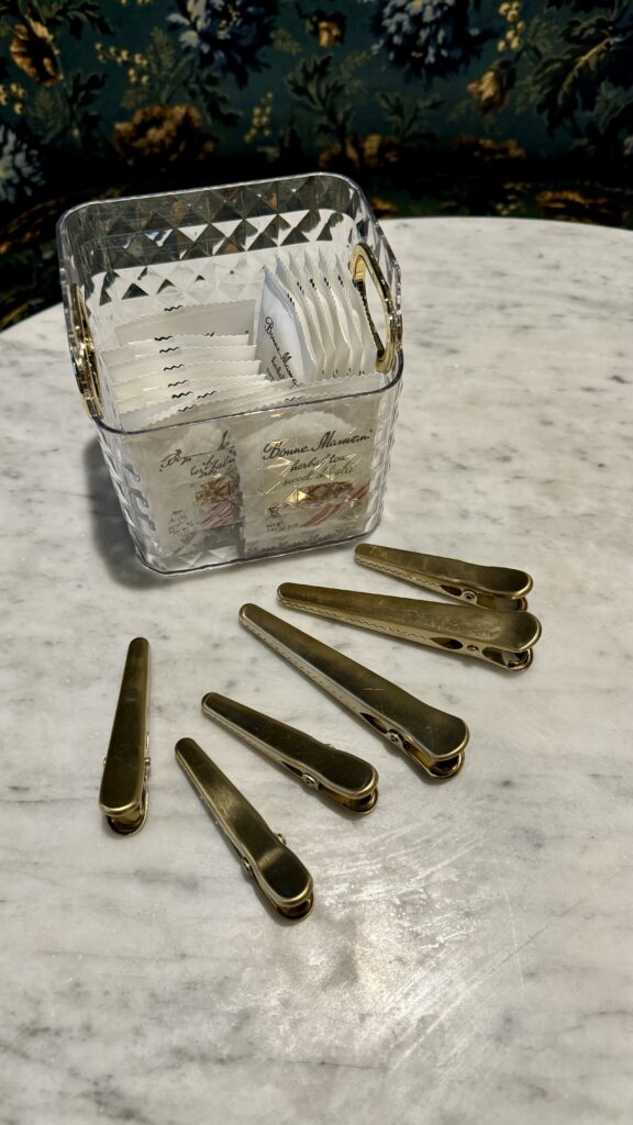To ensure that your cabinets don’t become a dumping ground for loose tea bags, coffee pods, and the like, grab some plastic storage containers at HomeGoods and put them to work. These cost just a couple of dollars each and will make a major impact on your kitchen. While you’re at it, grab a new, matching set of chip clips, also available at HomeGoods, to keep in your drawer. No one can afford to waste food, and now you can make sure that your prized snacks stay as fresh as possible.