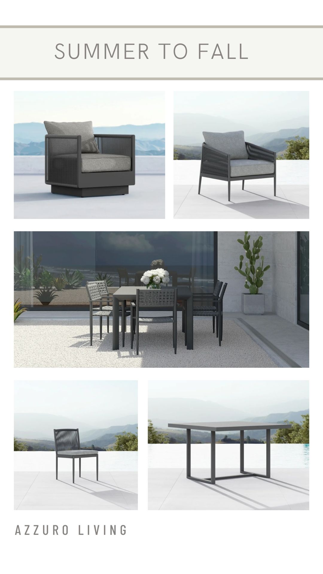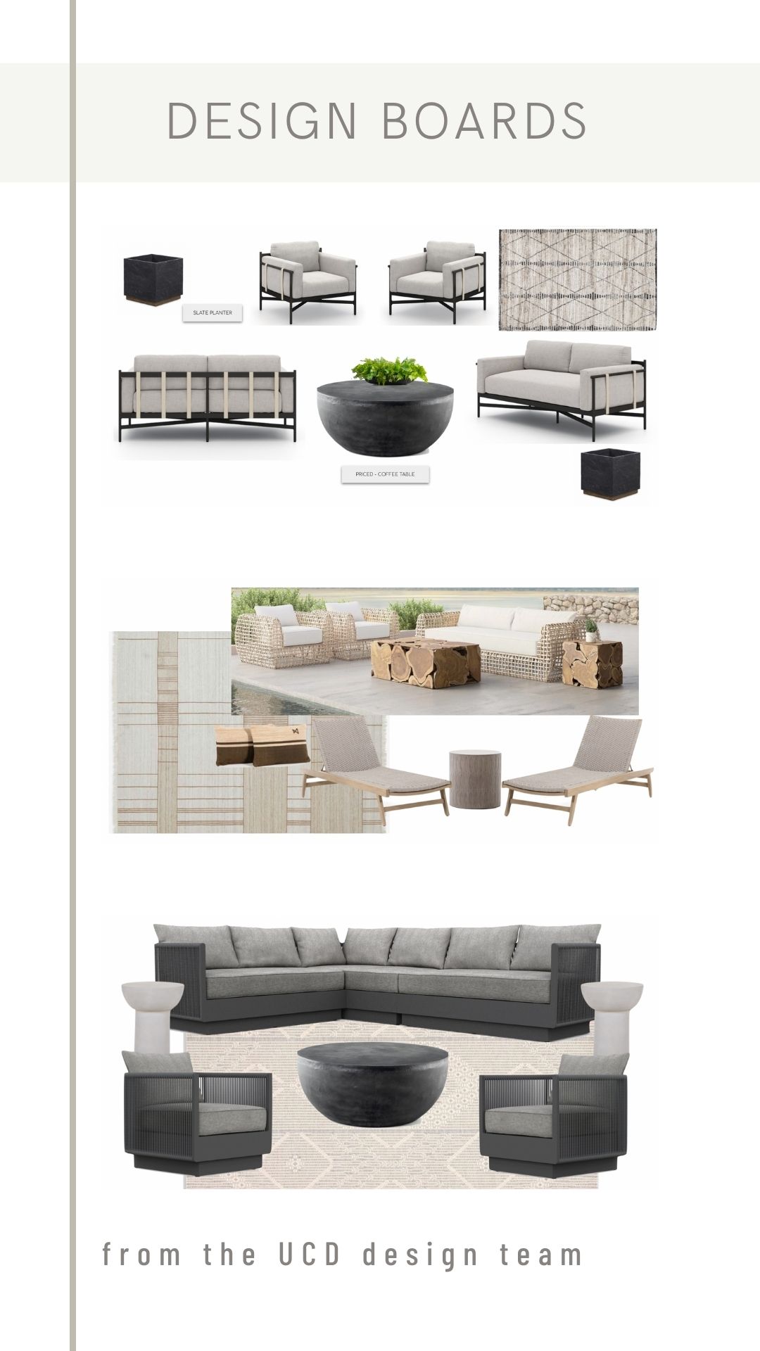 Finding the right outdoor furnishings and putting them all together can be difficult and overwhelming. We offer a full-service design team ready to help you with any of your needs/desires. Catering to many different tastes and styles, our designers work diligently to create a full design presentation. Here you will find a few examples of boards that highlight some of our favorite brands, while bringing in specific elements to heighten the environment with pieces that are durable and easy to maintain for a young family.