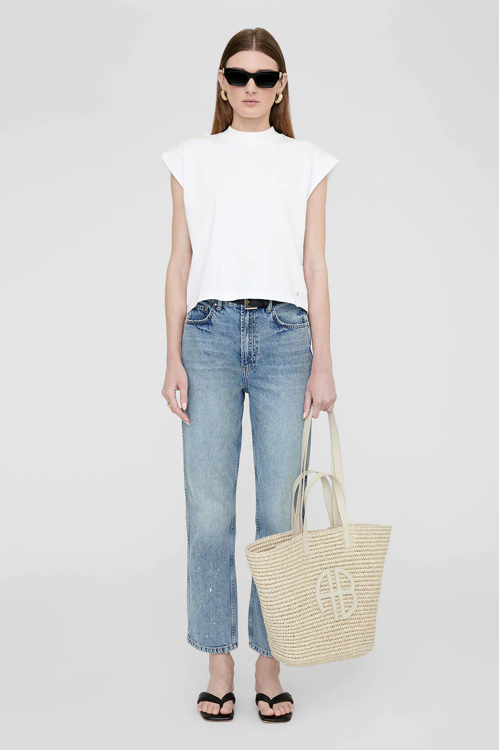 The Palermo Tote is a seasonal essential made from an unlined, woven seagrass material with leather accents in black. Its carryall construction features both short and long handles, and a magnetic top closure.