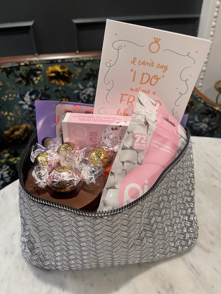 Treat your main girls to a “Will you be my bridesmaid?” basket that doubles as a self-care kit. Pick up a sizable cosmetic bag that zips shut (we love this silver glittery option from TJ Maxx) and fill it with some of your and your ladies’ favorite things. Start by picking out the perfect card and writing a thoughtful message inside — this one from the Paper Source is sure to become a keepsake. Then, go all in with the pampering theme. Paper Source is a great place to start, offering plenty of cute giftables, like the mini box of hairpins shown here. They’re great for everyday use and will come in handy during the hair and makeup portion of your wedding day!