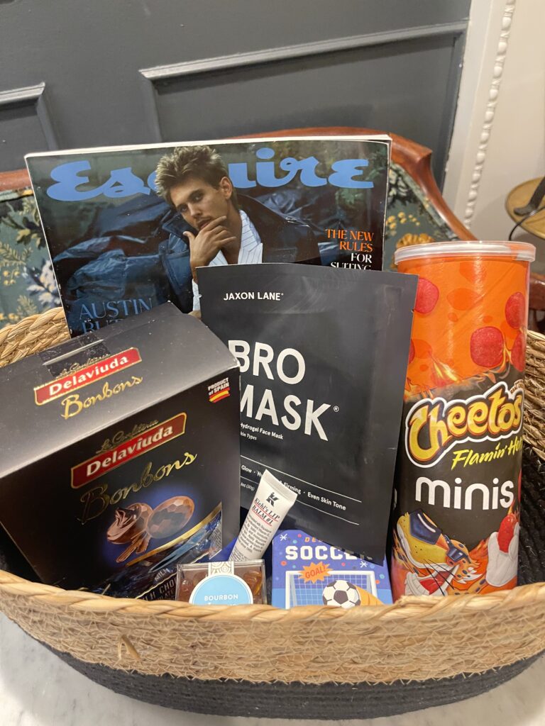 Inside the basket, we placed a few treats—both edible and otherwise, that will appeal to a range of guys. First, we stopped at Bluemercury for a Kiehl’s lip balm (men deserve little luxuries, too!). We then picked up a copy of Esquire magazine at Barnes and Noble and paired it with some snacks that he can enjoy while reading. At Target, we found a cylinder-shaped tin of hot cheese balls, and at the Paper Source, we picked up a small box of bourbon-flavored gummy bears. We also came across a face mask for men called the “Bro Mask” — he can throw it on as he unwinds in front of the TV.