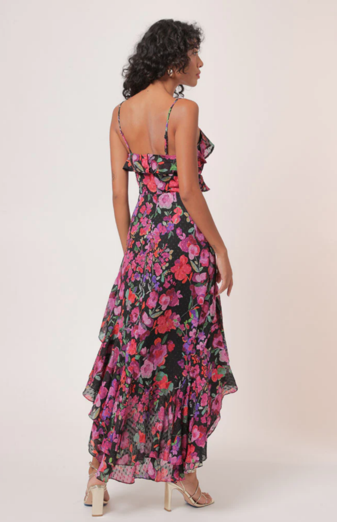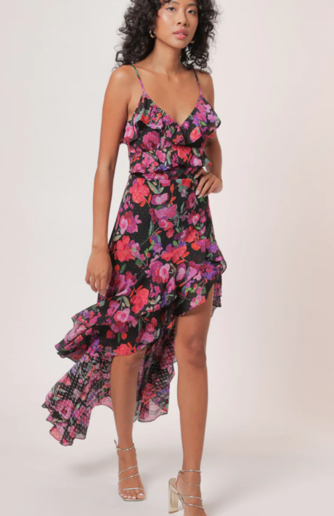 Florals are the perfect print for summer while florals for summer is not a novel trend, this year we are seeing darker, bold, and more moody floral dresses. This asymmetrical floral dress is statement making and is the perfect dress to pack for an upcoming summer vacation or to wear for a date night.