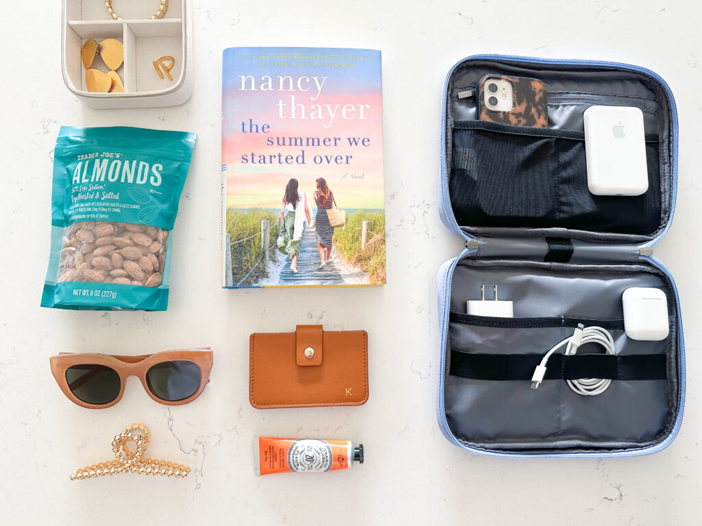 In my bag, I like to have a book to enjoy while in transit or help pass time during delays — Barnes & Noble has an incredible selection of my favorite genre, summer beach reads! I also make sure I have some of my favorite snacks from Trader Joe’s, like nuts and dried fruit. And, I always make sure my tech organizer, with a portable iPhone battery and extra phone and technology chargers, is in this bag so that I can stay powered up on the go; my favorite tech organizer is from Target!