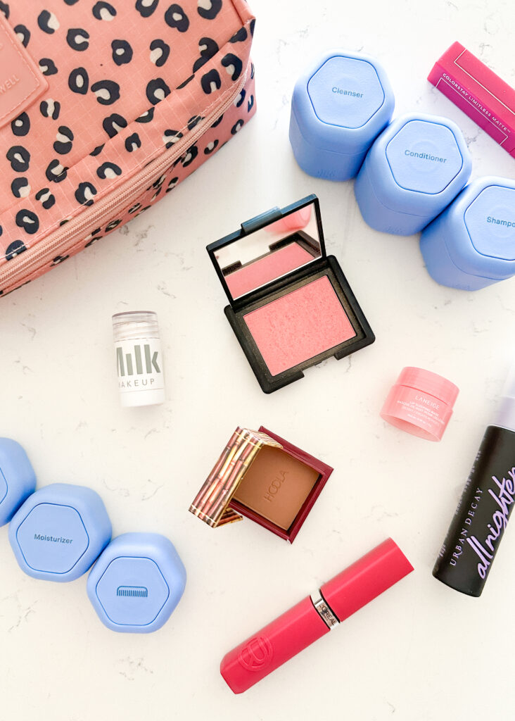 When it comes to my toiletry bag, I can’t recommend using refillable containers for your favorite skincare and haircare products and investing in travel-sized makeup enough. It allows you to bring along your essentials without giving up too much suitcase space.